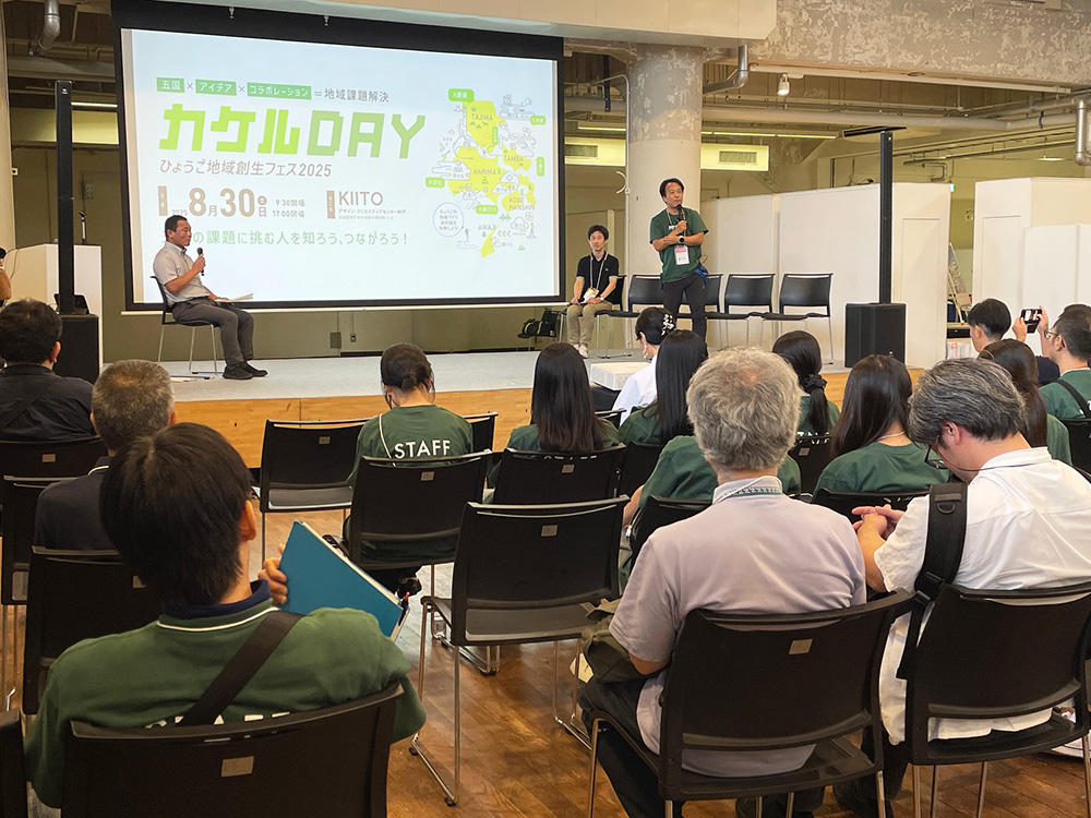 「カケルDAY」は、兵庫県初の試み「ひょうご地域創生コラボレーションプロジェクト」の集大成ともいえるイベントなんですが、春先のアイデア応募に始まり、事務局の方によるリアル・オンライン両面からのアイデア壁打ち等の伴走支援 → アイデアシートの作成・提出 → 展示のためのポスター制作 → プレゼンテーションやパネルディスカッションなどで当日壇上に上がるプレイヤーはその打ち合わせ → カケルDAY当日に向けてのブースの準備